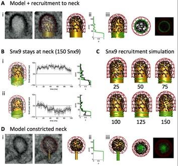 Figure 1: Spatiotemporal ReaDDy model and simulations of dome-shaped (A-C) and constricted (D) clathrin coated pits (CCPs). Color-coding: Membrane (gold), SNX9 (green), clathrin (red), other CCP proteins (black). EM micrographs (Ai, Di) were used to model the CCP membrane before and after constriction.